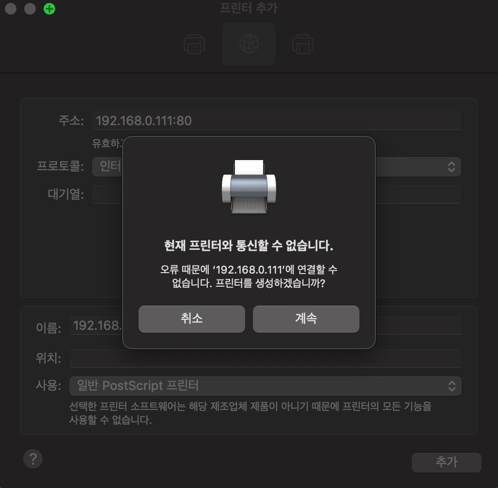 이프린터와 통신이 되지않습니다 등등 오만가지 오류를 다봤음