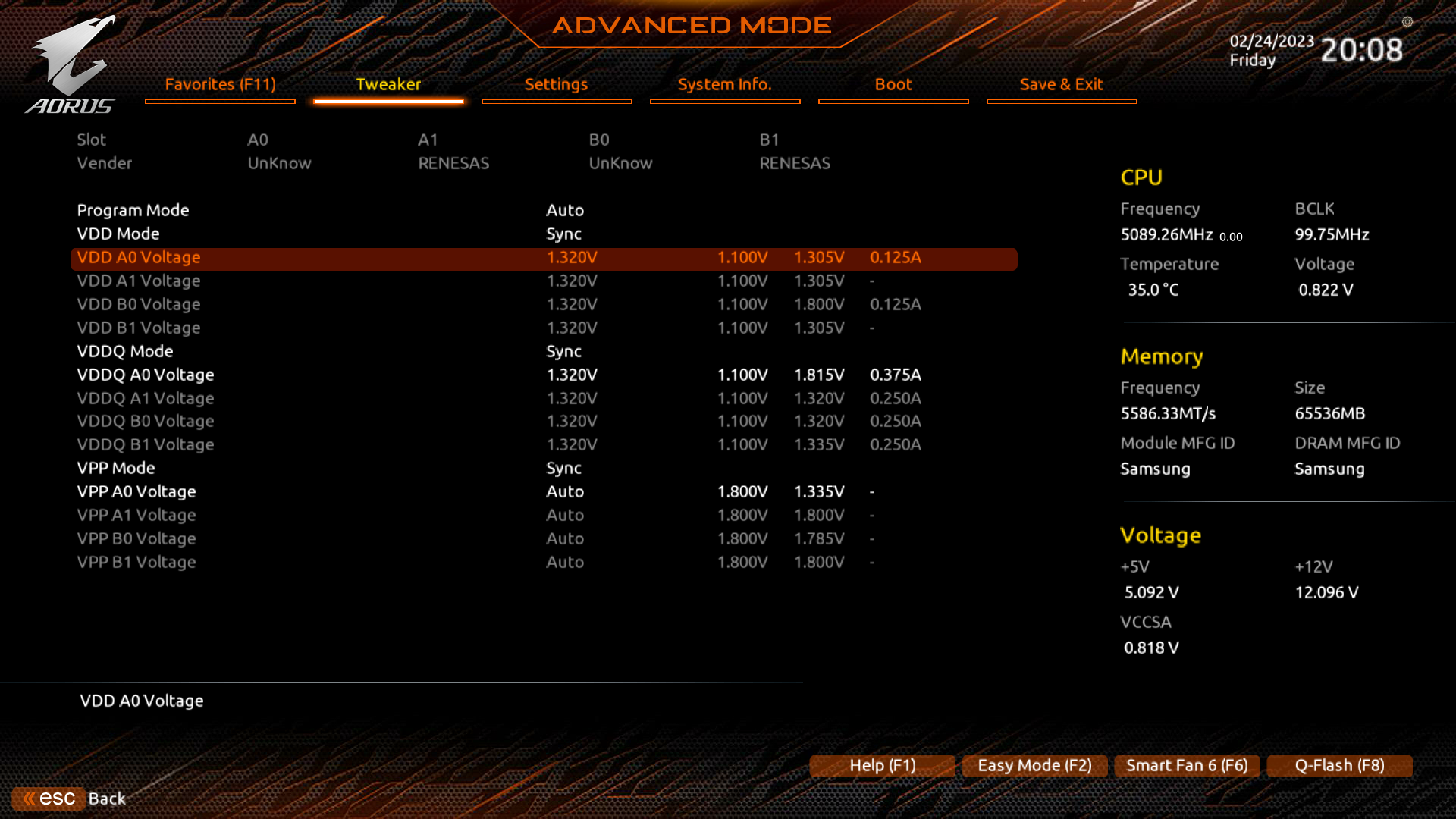 이중에 VDD A0 Voltage 와 VDDQ A0 Voltage를 1.320V로 변경해 줍시다
