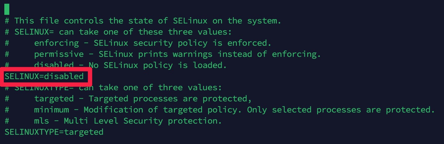 들어가면 중간에 덜렁 혼자 주석처리 안된 SELINUX라고 써있는 문장있음 이거 disabled로 변경 후 저장후